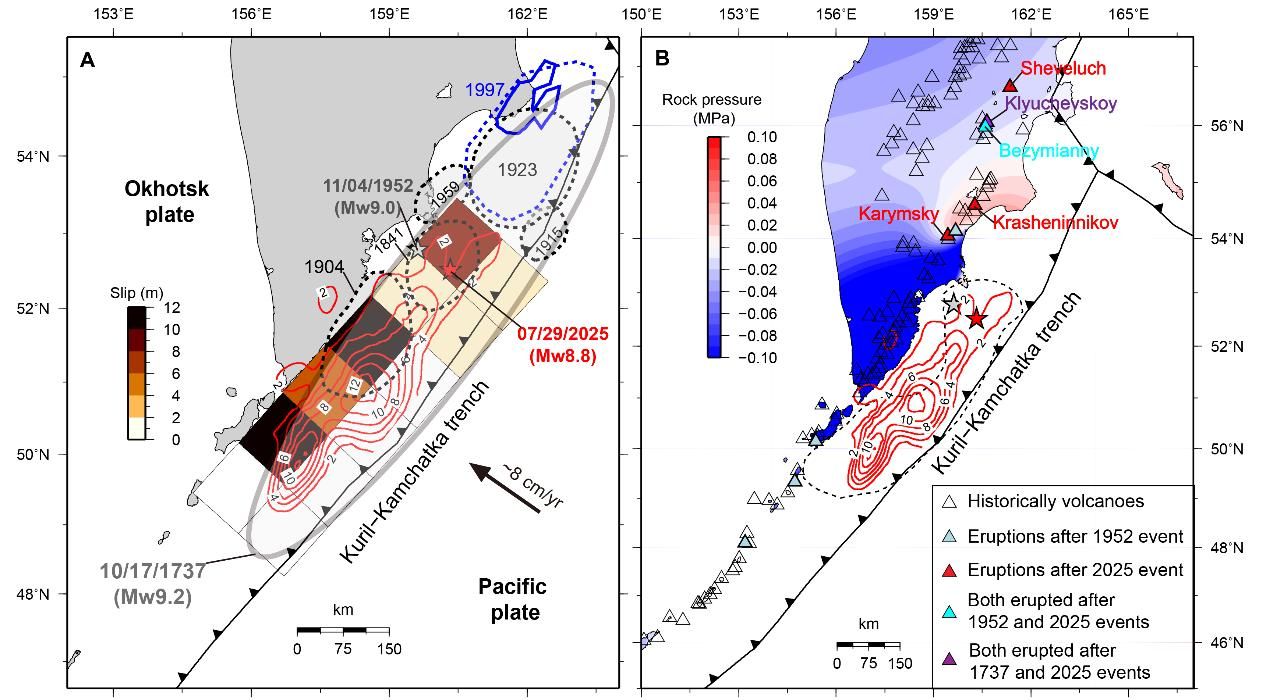 针对此次地震的前置活动与后续影响,研究团队还取得多项重要发现:主震发生前一年内出现的两次异常活跃前震序列,其清晰的时空迁移特征,揭示了区域应力逐步积累并最终触发主震的完整过程,为认识俯冲带特大地震的孕震阶段与起裂机制提供了关键观测约束;通过对滑动分布的分析,发现此次地震局部最大滑动量超过了1952年以来该区域理论累积的滑动亏损,表明堪察加俯冲带或处于“超级地震周期”,即通过多次不完全破裂和阶段性大震,在数百年尺度上逐步释放长期构造应变;主震后堪察加多座活火山相继喷发或活动增强,应力变化计算证实,此次强震显著扰动了区域岩浆系统,为地震—火山相互作用的研究提供了新的实证。
